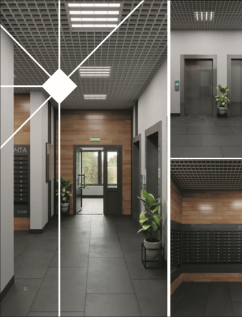 Подъезды, лестничные клетки и просторные лифтовые холлы дополнят общее впечатление о жилом комплексе. Этим пространствам уделено особое внимание, так как важно