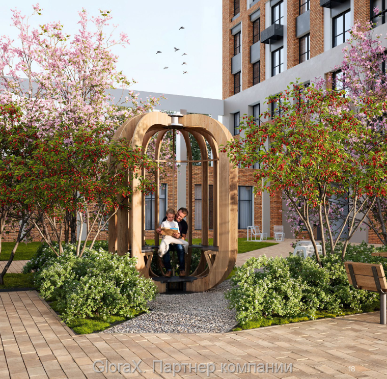 Ландшафт дворов разработан так, чтобы создавать естественные сценарии взаимодействия — тенистые аллеи для неспешных прогулок, комфортные скамьи с дизайнерскими перголами, места для чтения,