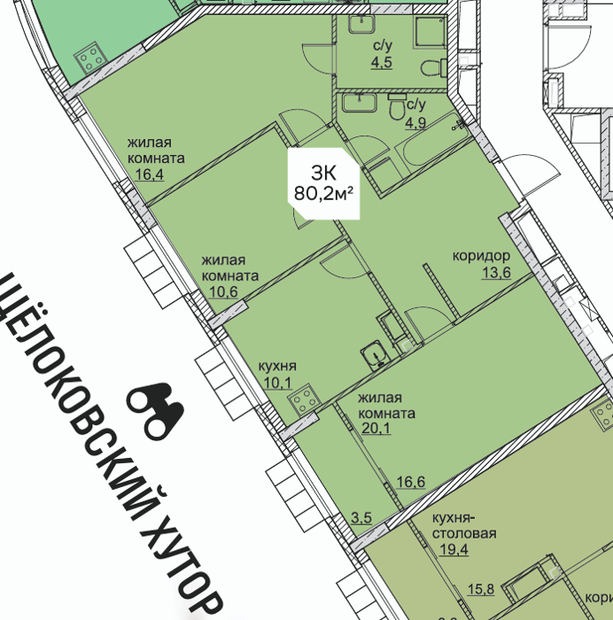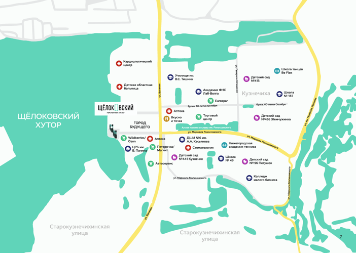 Территория жилого комплекса примыкает к Щёлоковскому хутору - лесу более 30-ти гектаров с озёрами, пляжами и тропами для прогулок, который является излюбленным местом для отдыха горожан в черте города.
