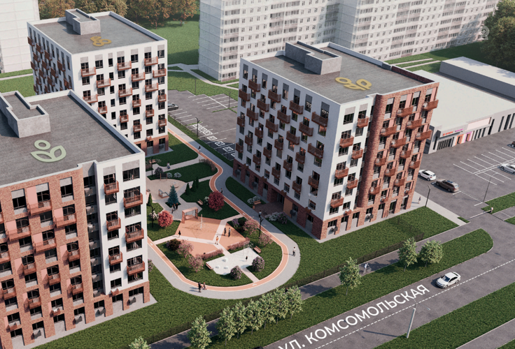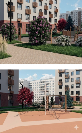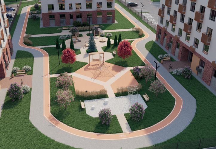 Проект представлен игровой площадкой, пешеходными и велосипедными дорожками, а также местами для отдыха. Цветовая гамма и внутренняя геометрия поддерживают стилистику фасадных решений.