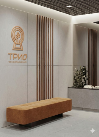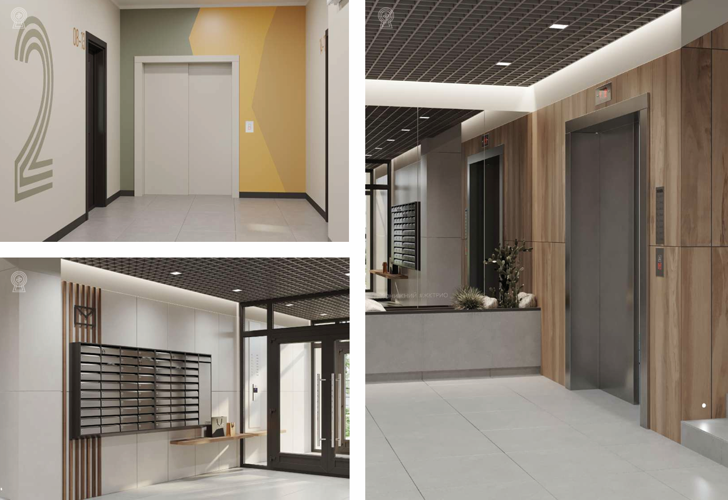 В минималистичном интерьере холлов используется светлый керамогранит и яркие необычные акценты.